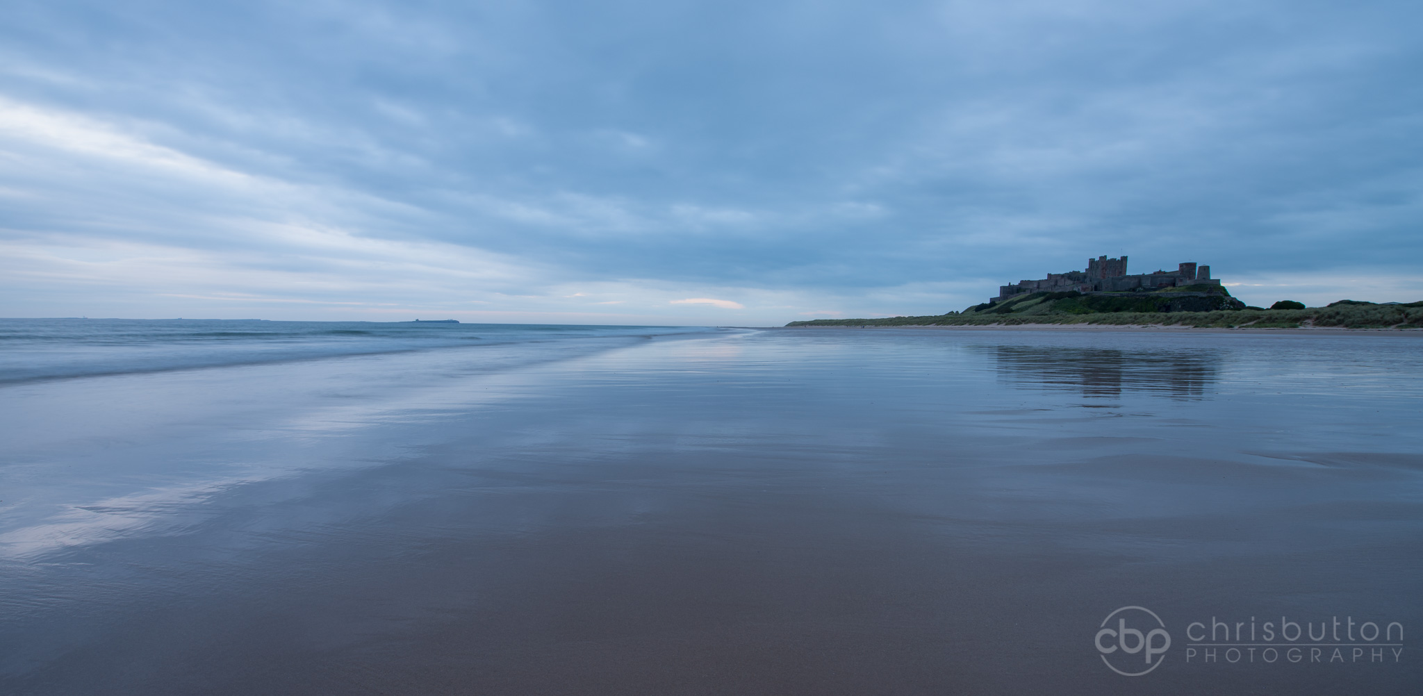 It’s worth hunting out wet sand on a retreating tide. You can just make out the Farne Islands on the horizon with its chapel on the left-hand side.