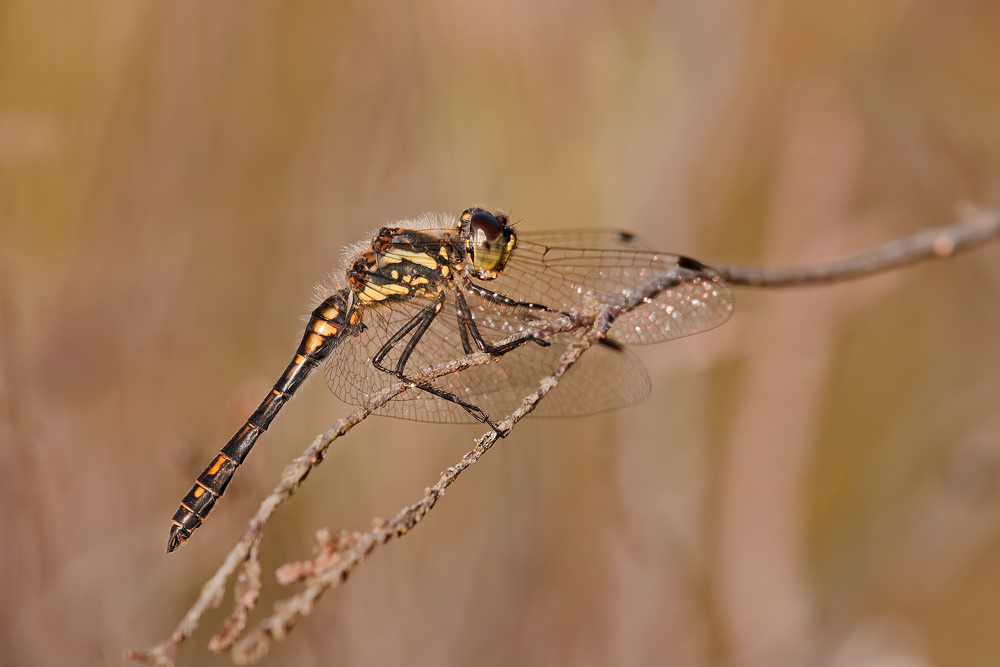 I was hoping to find several Black Darters roosting in the low heather as the afternoon temperature cooled and the dragonflies slowed down. However it soon became clear that Black Darters move into the trees at dusk and finding them was very difficult. Thankfully, I eventually found this male and managed a few shots before he too left for the nearby trees.