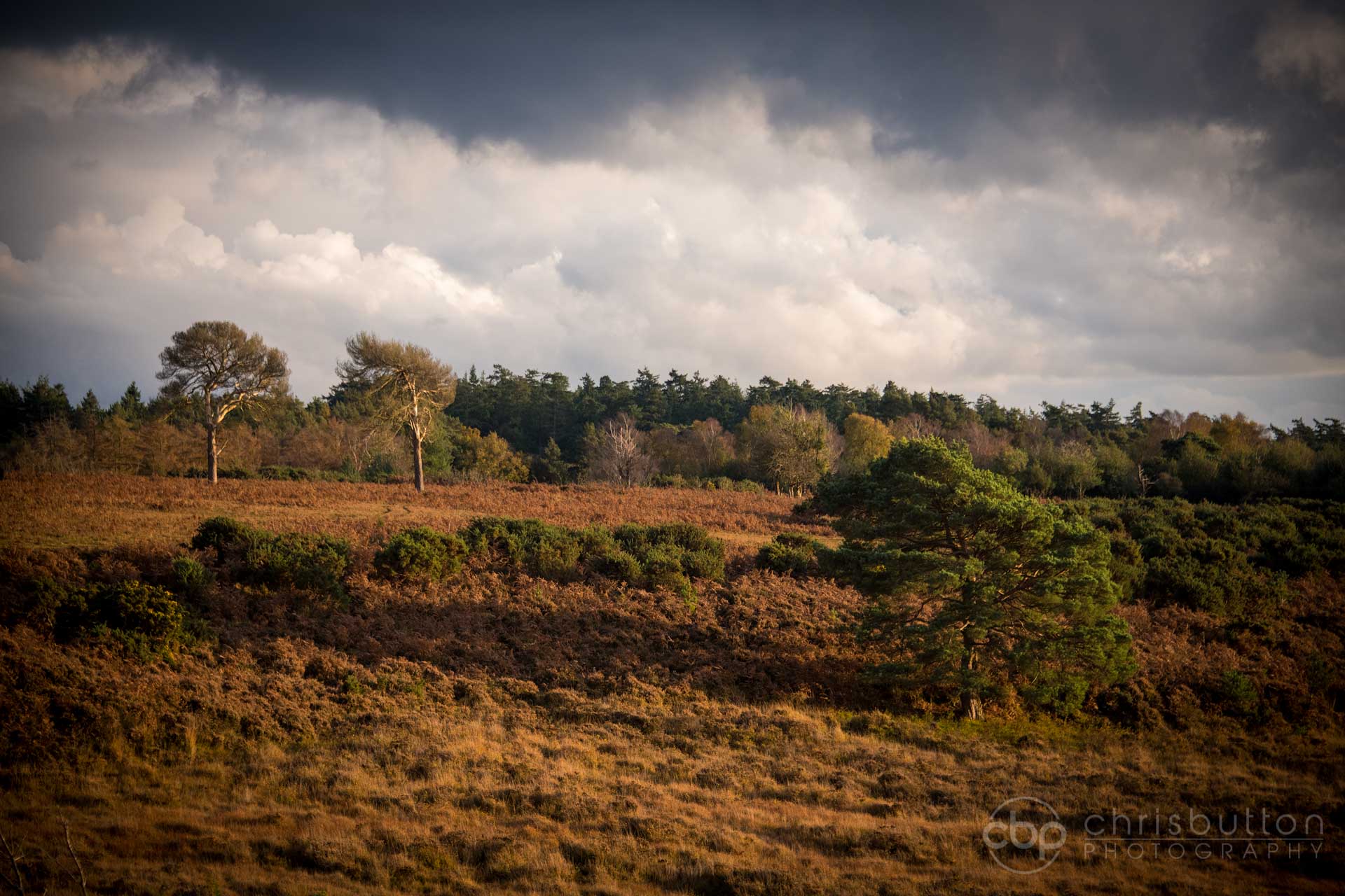 Side lit heathland with interesting trees and skies near the car park at Bratley View.