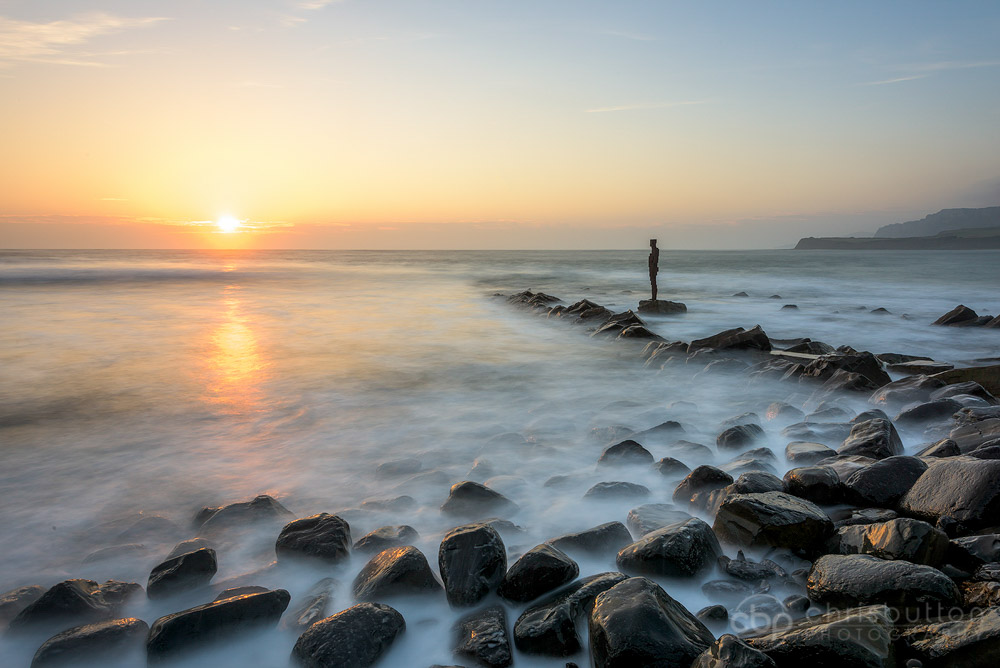 In May 2015 a full size cast iron man by Antony Gormley had been erected next to Clavell’s Pier in Kimmeridge Bay. He was due to be in position for 12 months but in mid September he was toppled in stormy weather and he then lay wrapped in sandbags for months. Before his demise I had taken a few clients to photograph him but didn’t take any images myself, instead planning to revisit on my own sometime. I was therefore a bit alarmed when it appeared that he wasn’t going to be put back up again. However 3 months later he was back and I took a client to shoot sunset there. With the tide forecast at 1.6m this was getting a little high for the pier but would be perfect with the addition of the extra cast iron focal point. 2 weeks after taking this image the statue was sheared off at the ankles by another storm and it looks fatal this time!