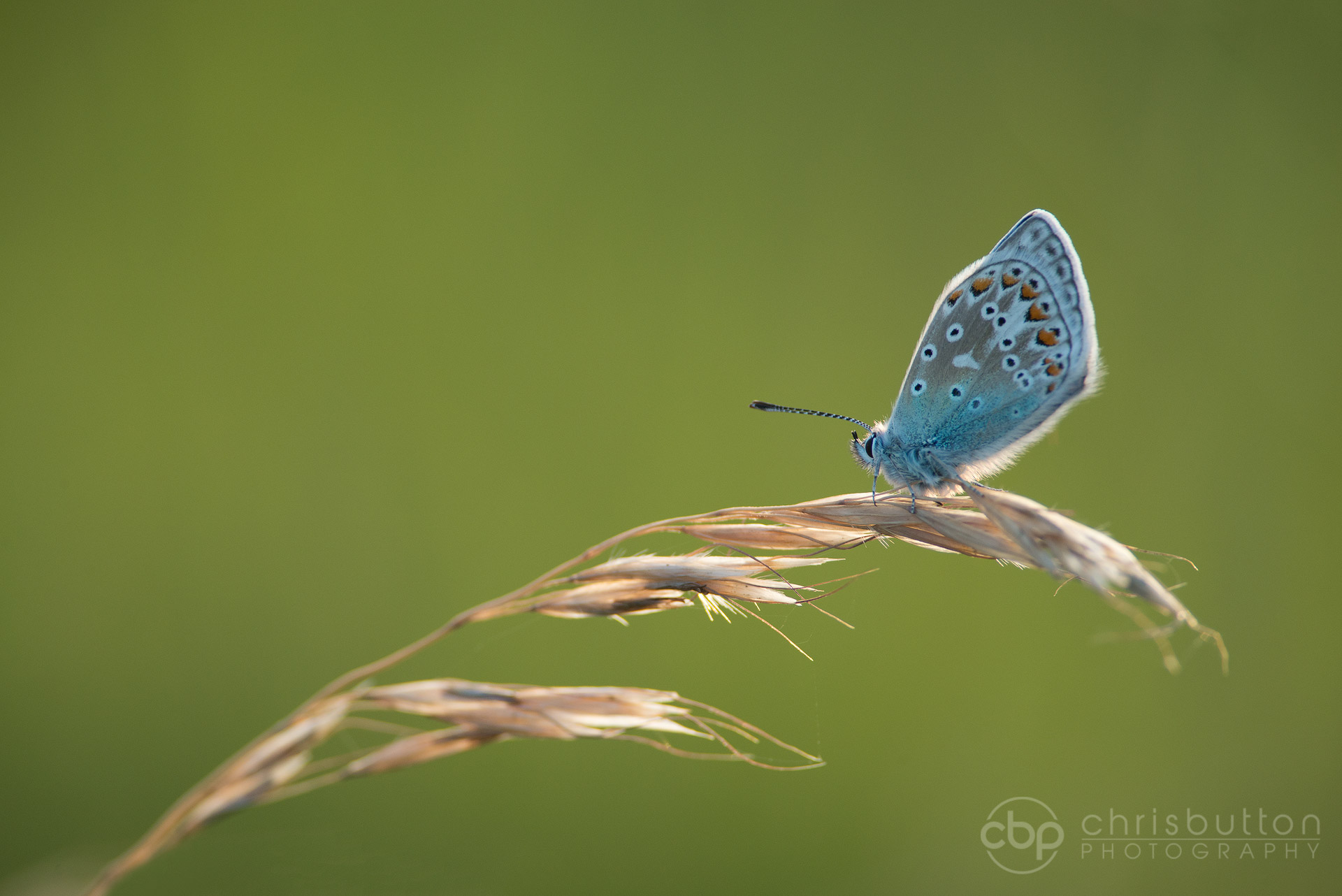 An obliging male Common Blue roosting in evening light. I used a tripod but in the breeze it was subject movement that caused the problem and so I needed to keep the ISO up.