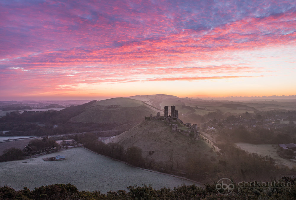 I planned a November visit to Corfe Castle in the hope of just the right amount of mist. On my first visit mist was forecast but there was too much and it was better described as low cloud and fog, I left an hour later without having seen the Castle! On the return journey a few days later it became clear that there would be no mist at all although on arrival I could see a cloudy sky and an exciting clear band at the eastern horizon. As the sun neared the horizon it lit the undersides of the waiting clouds and a textured scarlet sky developed above me, this shot was 15 minutes before sunrise.