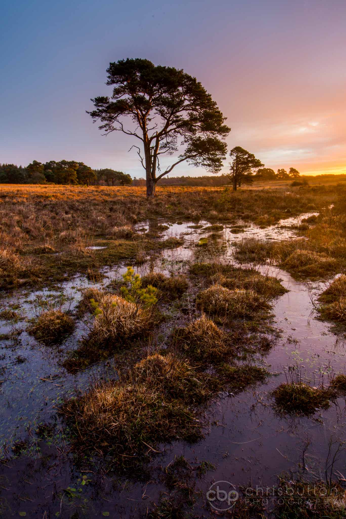 A single pine tree at sunrise near Duck Hole in the New Forest. Warming light was just starting to spread across the heath and I liked the way the tufts of grasses led the eye to the tree and then the water channel led on into the sunrise.