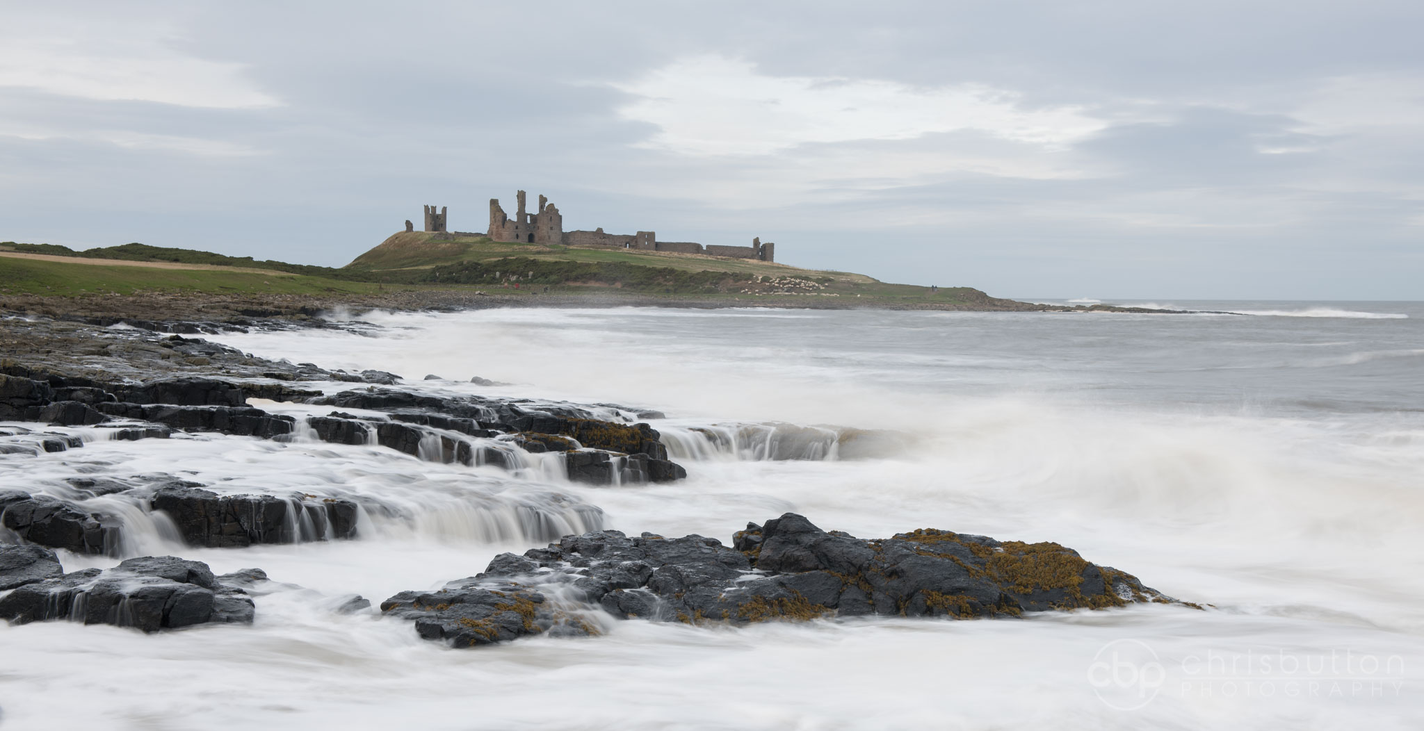 This is the view from the south of the castle which is reached by walking north from Craster. At high tide there is a handy raised flat area of rocks near the first gate where you are safe from the tide as it races passed in front of you.