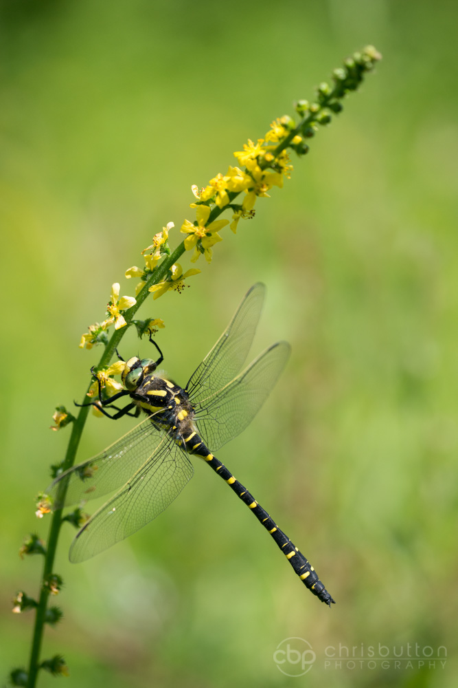 A Golden-ringed Dragonfly clinging to Agrimony on a windy July day at St Catherine’s Hill Winchester.