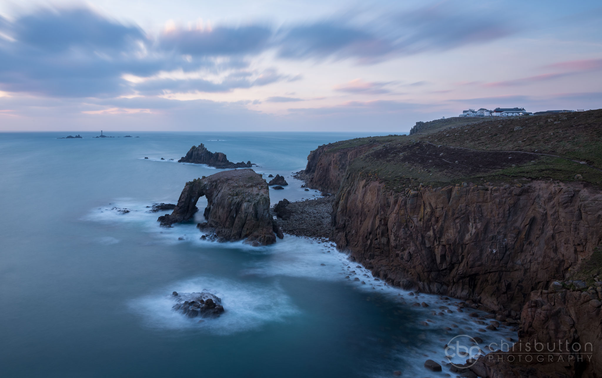 Some lovely pastel tones at sunset looking across to the Enys Dodnan rock arch. A Peregrine bombed past just below us and several Choughs tumbled around the cliffs nearby.