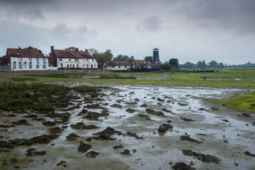 A dark, wet and gloomy Langstone Mill. Shot quite late at low tide with the lights coming on in the Royal Oak and also in the mill itself which is now home to someone.
