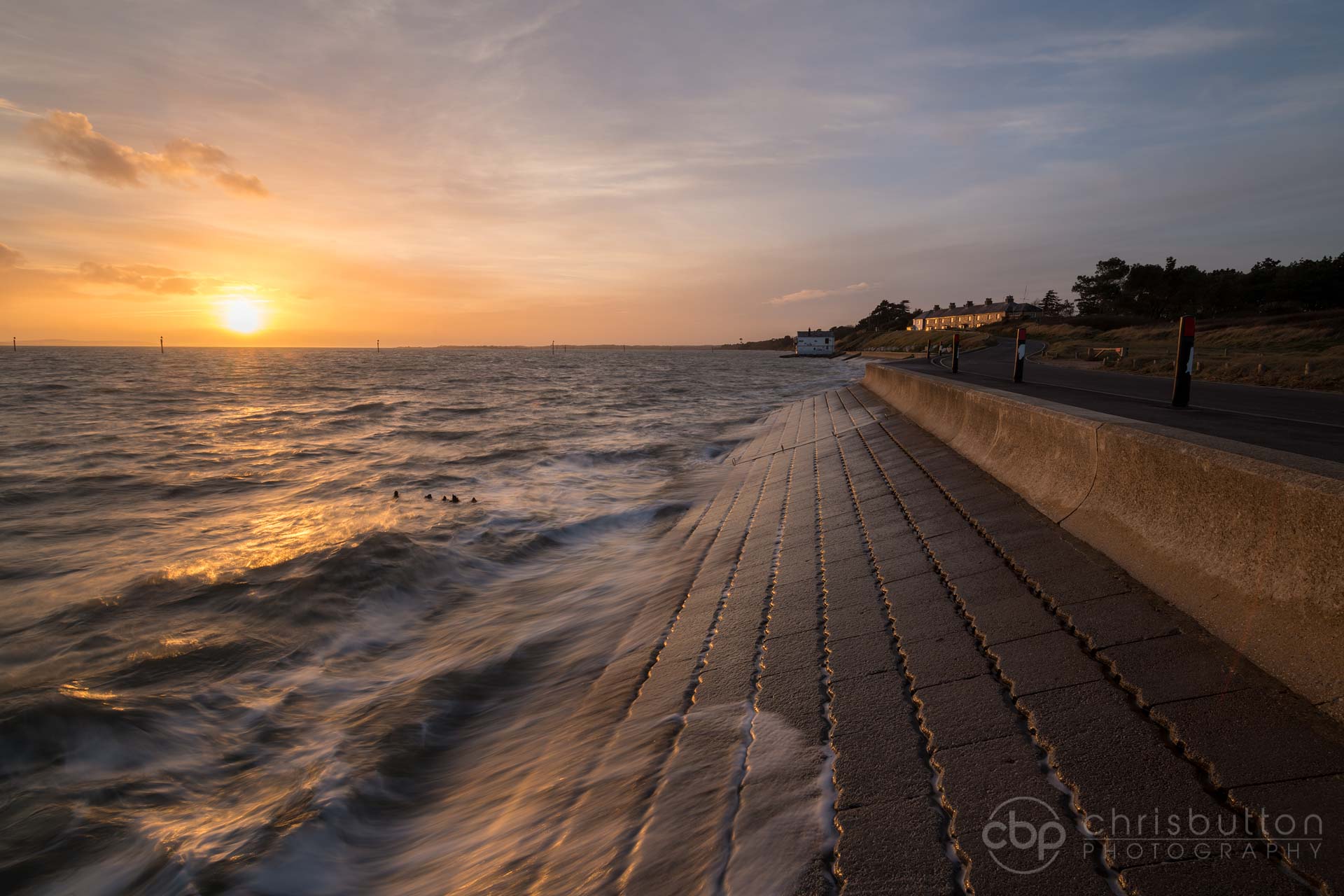 The imposing sea defences at Lepe Beach. The light on the sea wall and the coastguard cottages lift the image but shooting with the sun in your image leads to high contrast range issues and with sea spray in the air I find that graduated filters are difficult to keep clear, the sun in your image will also highlight any rain or sea spray on your graduated filter. In these circumstances, therefore, I usually bracket exposures and by varying the ghost amount choices in Lightroom you can decide on the most flattering amount of sea movement.