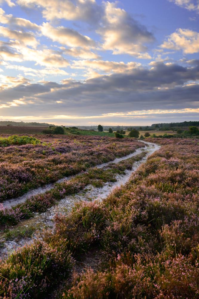 At this time of year there is an attractive variety of colour in the New Forest - the lilacs of Ling (Common Heather), the brighter pinks of Bell Heather, the browns of fading heather and the greens of ferns. This image was taken just as the sun finally appeared above the clouds flooding the heather with direct light.