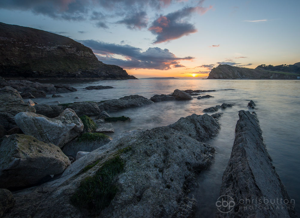 On a previous visit to Lulworth Cove I knew that these ledges looked good at a 0.7m tide level, on this workshop I knew the tide was higher but at 1.3m it was still low enough to get some lovely images of the twisted limestone ribs which lead the eye nicely. It was a spring tide and so the tide came in pretty quickly and by the time I left 20 minutes after sunset I could only just get back around the corner to safe ground. 1.6m appears to be the limit for this shot!