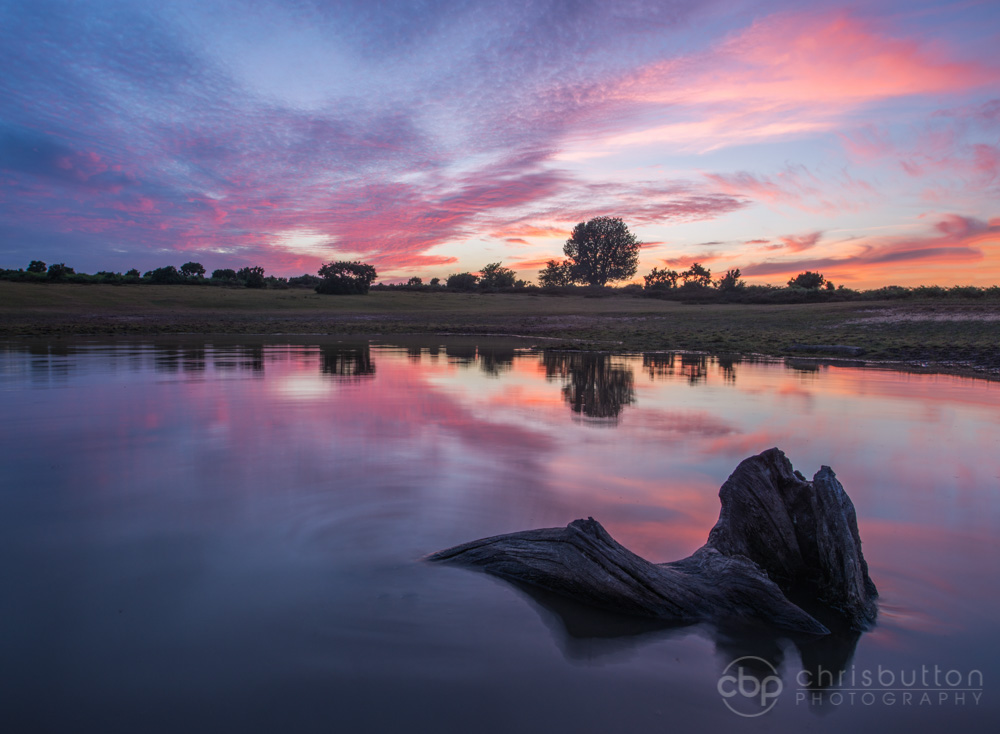 On the walk back from photographing a single oak at Fritham Cross I noticed the sky starting to colour up nicely and so I ran back to the pool at Mogshade to try and get some reflected sunset colours. I waded into the pool turned to face north west and shot fairly low down to maximise the reflected colour and thankfully it was very calm and so no ripples.