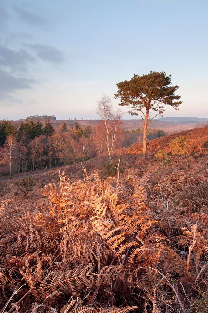 In comparison to some of the larger plains in the New Forest Rockford Common provides a bit of variety as it includes interesting contours and steeper slopes with isolated birches and pine trees. This composition was made just below the top of a slope with the low sun setting behind me in the south west. The sun was just high enough to clear the slope and brighten the tops of the bracken and light up the Pine on the opposite bank. Within seconds of this shot, however, the sun had dipped below the horizon behind me throwing everything into shadow.