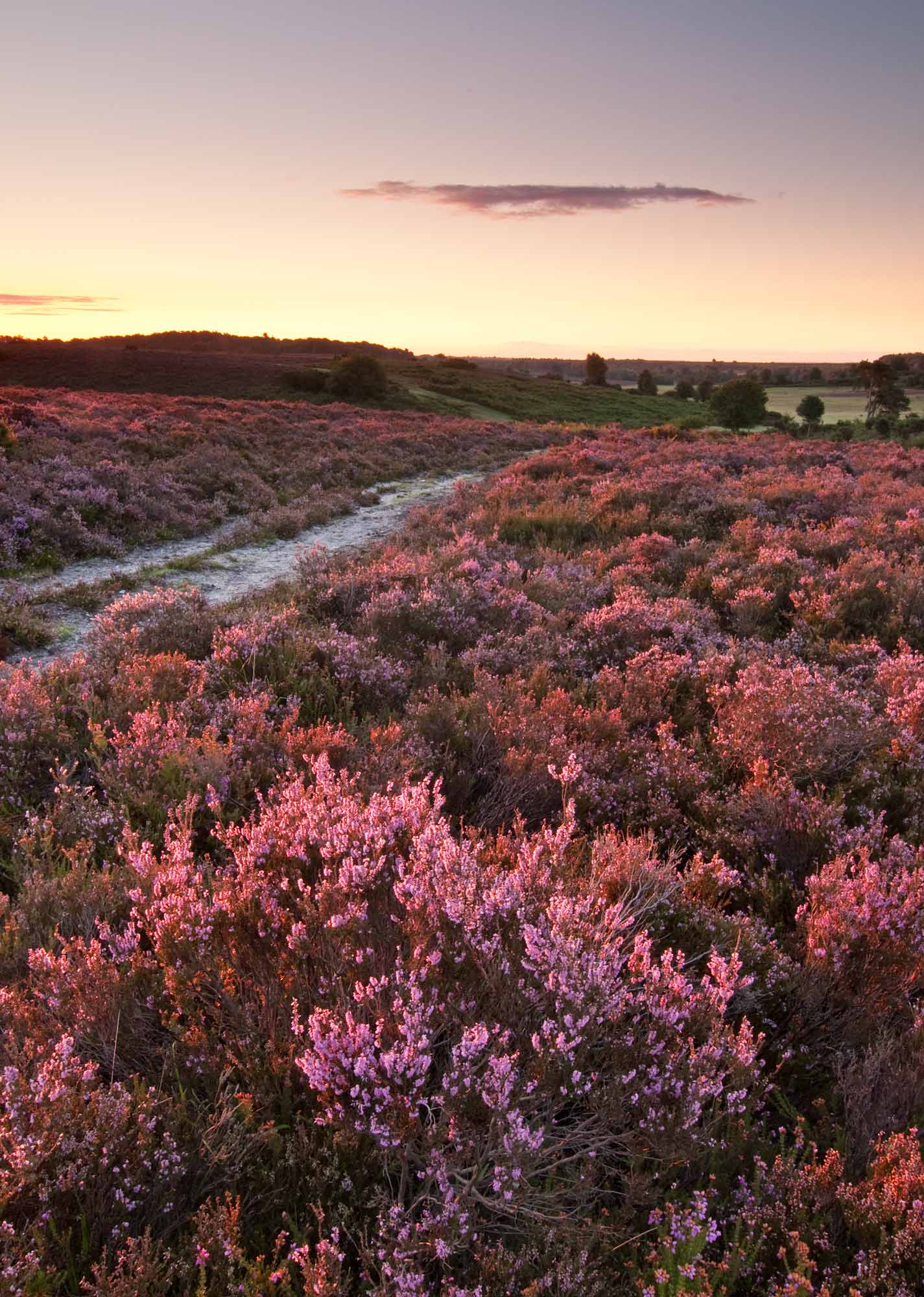 Longslade Bottom is a horseshoe-shaped plain with prominent pine trees and with paths leading the eye down from the bowl shaped sides of the plain. I visited in August being the peak time for the purple colours of the heather. I found a composition which included a south easterly running path and a prominent patch of heather in the foreground. The image was really lifted when the carpets of Bell Heather were sidelit with the dawn sun giving a gorgeous pink coating to the flower tops.