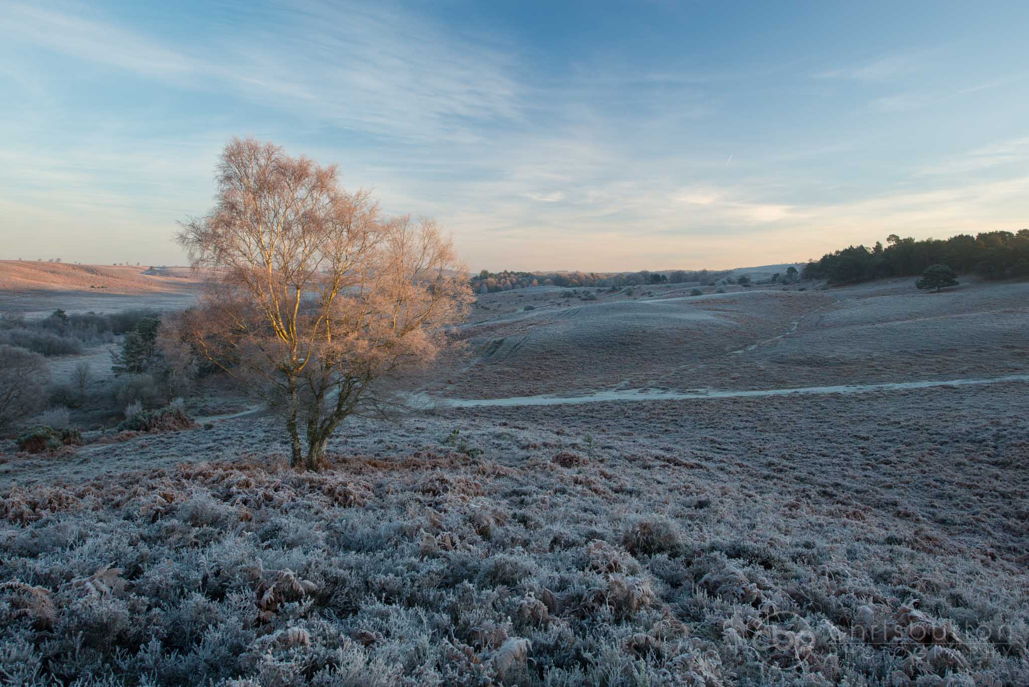First light just catching the top of the silver birch on a frosty morning in the New Forest.