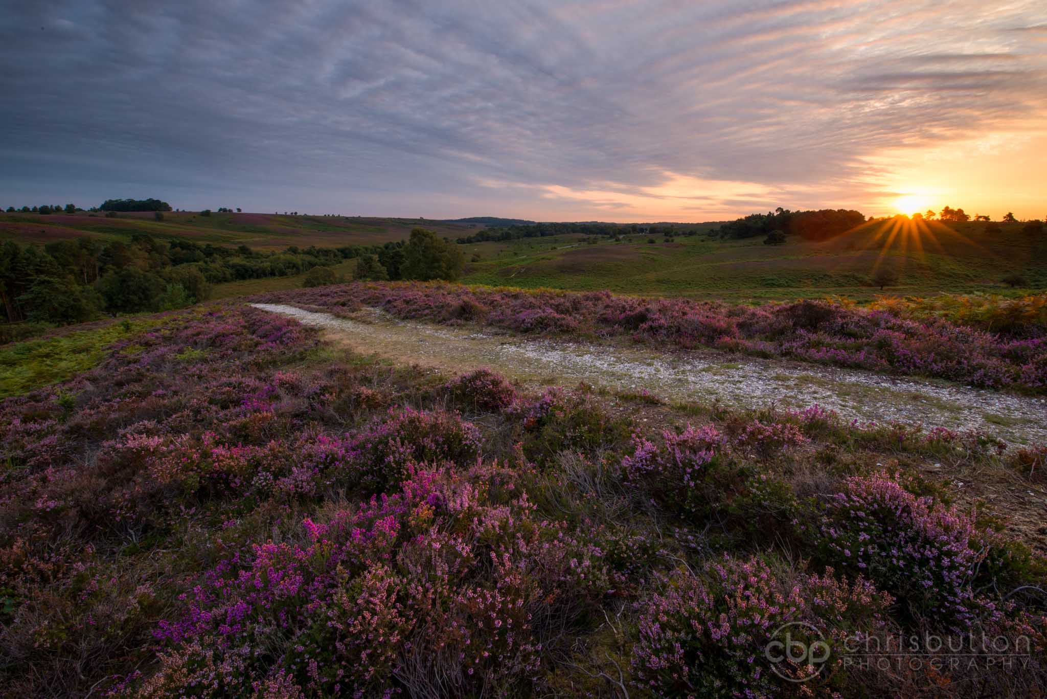 Landscapes (as opposed to seascapes) often work best after the sun is up with rich side lighting and with the sun well out of the picture. Sometimes, however, I can’t resist the urge to include the sun although its best done when the sun is very low or partly blocked or partly held back by hazy clouds. In late August the rising sun is already marching quickly towards the south (to the right in this view) and so to include the sun and keep the end of the track well within the picture I needed an ultra wide 14mm lens. I chose a very small aperture of f22 to enhance the starburst.