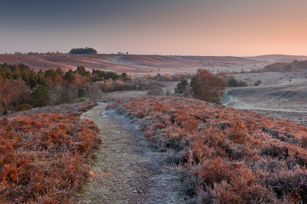 This was the second weekend running that I had stood at the top of this New Forest track in the darkness 30 minutes before sunrise. Last weekend the sun had been blocked out by 100% cloud cover and I returned home disappointed. This weekend there had been some of the mist that I was looking for but it had quickly disappeared. The bonus today was the icing from the frost and although some clouds would have been better a clear sky allowed warm side lighting which lifted the subtle delicate browns.