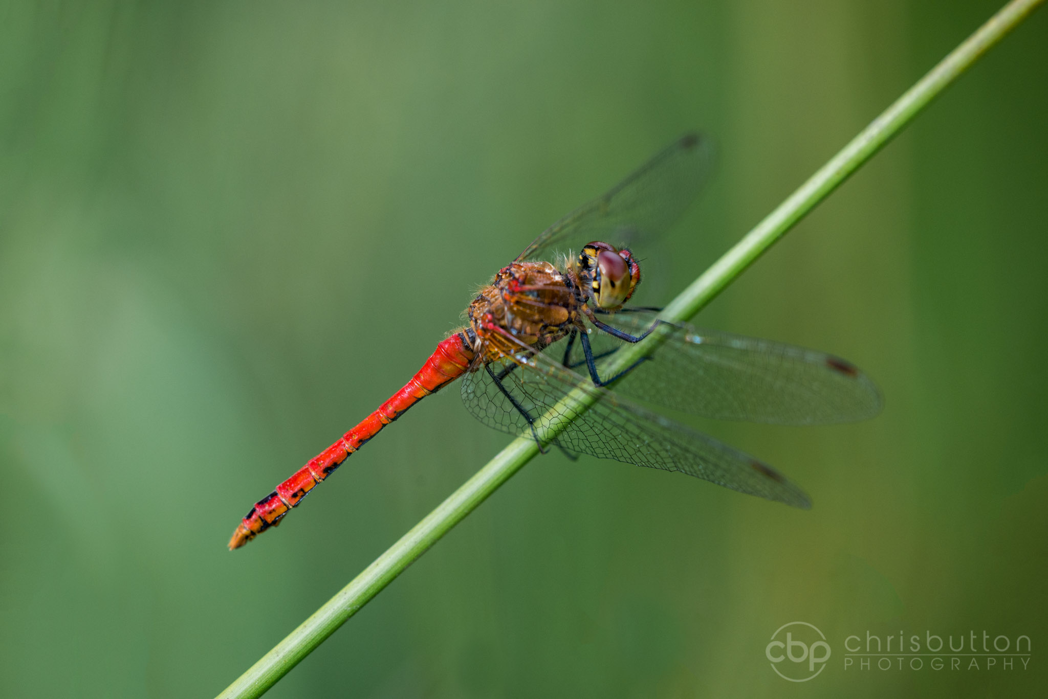 This active male Ruddy Darter gave me the run around for a while before he finally settled and allowed me to get some images. I used a wide aperture to blur the background but getting the eyes and the tail tip in focus at apertures like this is almost impossible. To get around this I later blended the sharpest overall image with a second image which showed the tail tip in better focus.