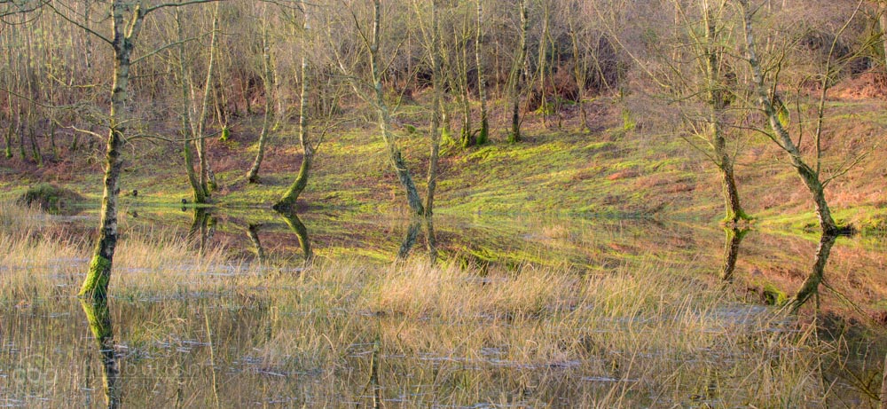 A longer focal length enabled me to simplify things and to pick out interesting compositions. I really liked the slightly haphazard angle at which these birch trees stood at the waters edge. A letterbox crop excluded distracting highlights from the tree tops and I loved the way the two outer trees framed the composition.