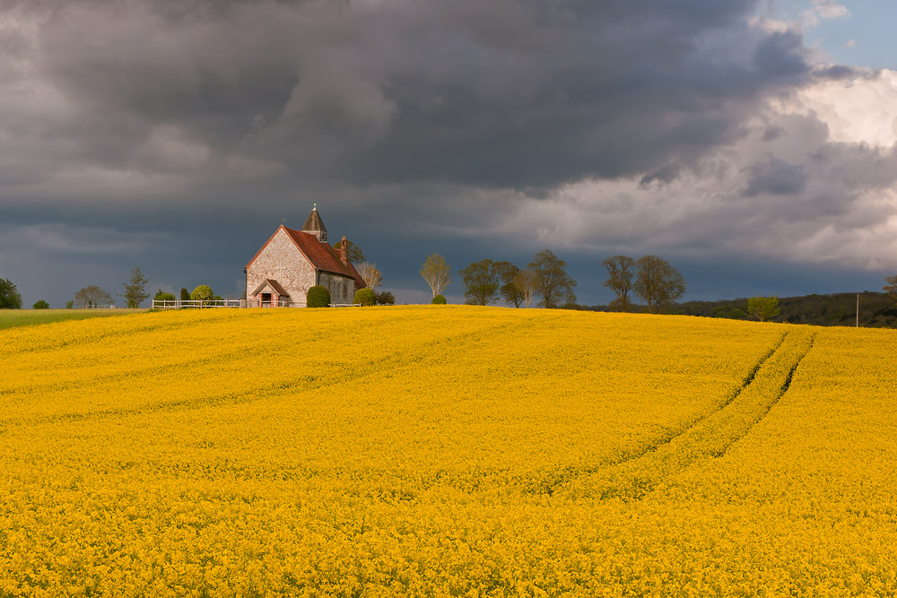 My third visit this week to the ‘little church in a field’. I was keen to catch it surrounded by the striking yellow of oil seed rape. The two previous evenings there had been no break from overcast skies but this evening the skies were clearer. There were 5 photographers when I arrived but with storm clouds approaching they packed up and left the best of the light just for me. In this shot the church stands in full sunshine but with menacing clouds building up behind and shortly after this shot I was caught in a storm of hailstones.