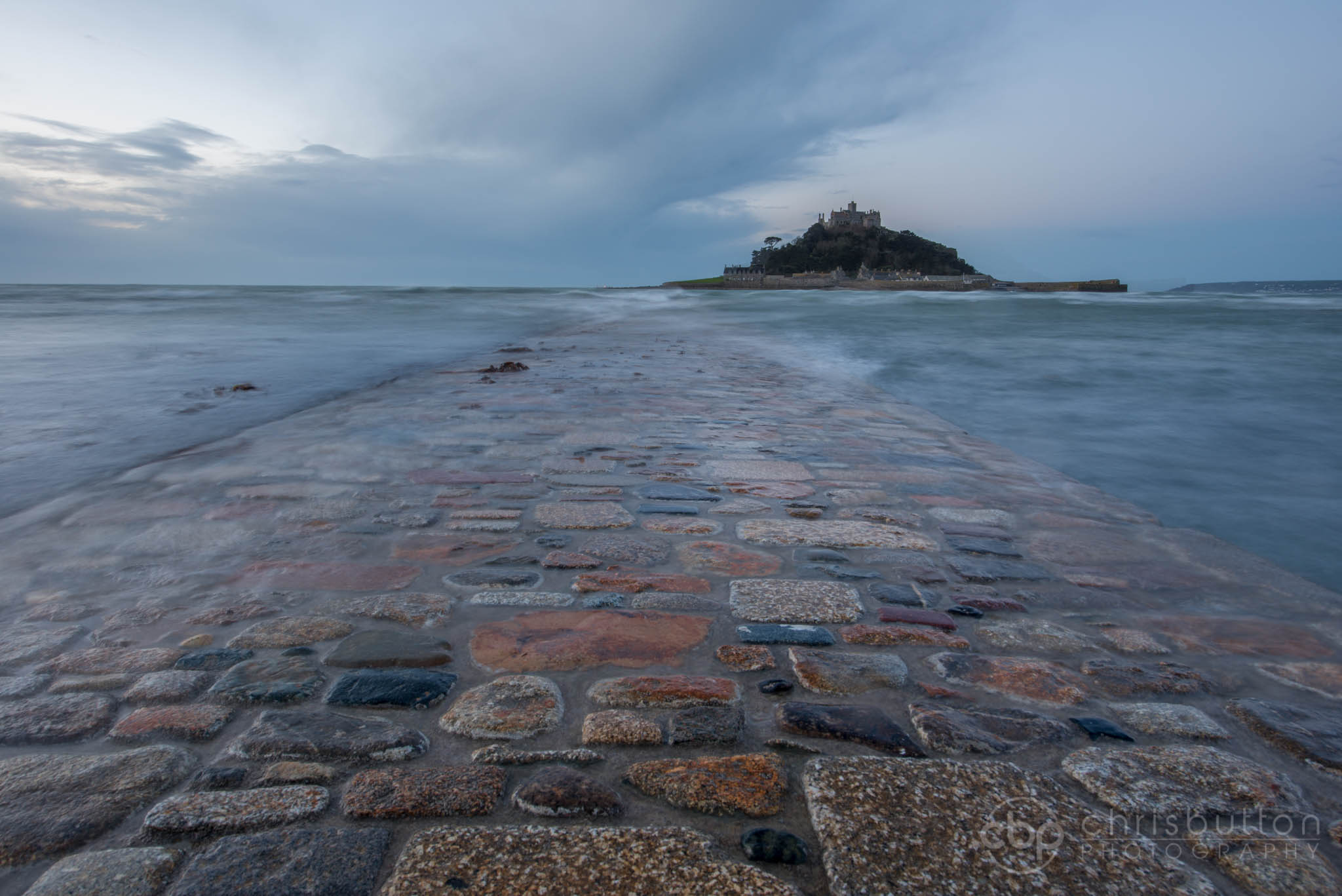 A mid tide at dawn at St Michael’s Mount. Because this viewpoint looks south you hope for either rich side lighting from the left at sunrise or perhaps pre-sunrise colour spreading across into the southern sky. Alternatively, as on this occasion, you can settle for lovely soft and diffuse lighting with an interesting sky.