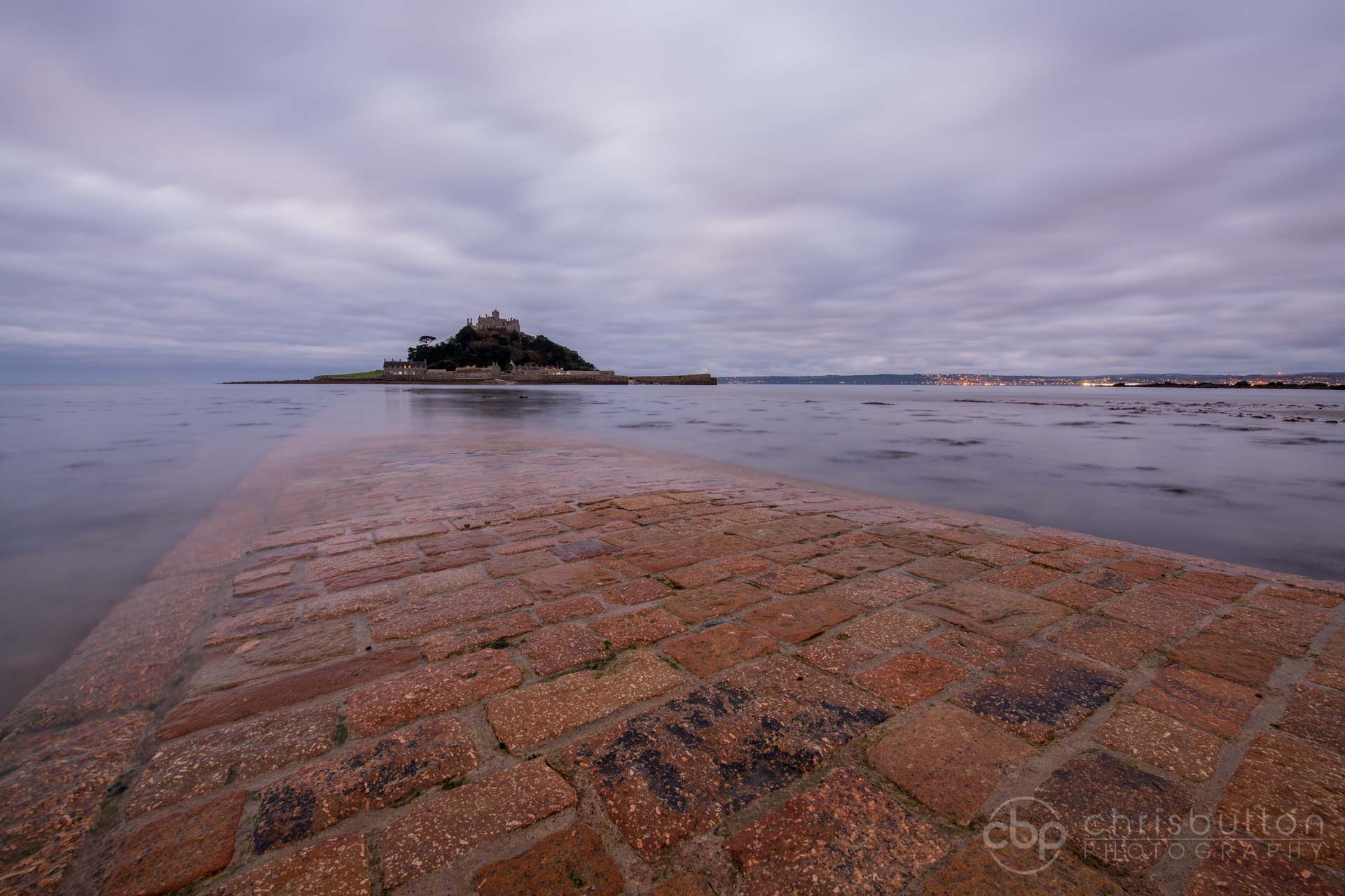 We were hoping to get some early light on the causeway, but an overcast sky meant there was no gap at the eastern horizon to our left. My favourite image from the shoot was this wide angle shot well before sunrise with the lights of Penzance and Newlyn (the 2nd busiest fishing port in Cornwall) visible in the distance.