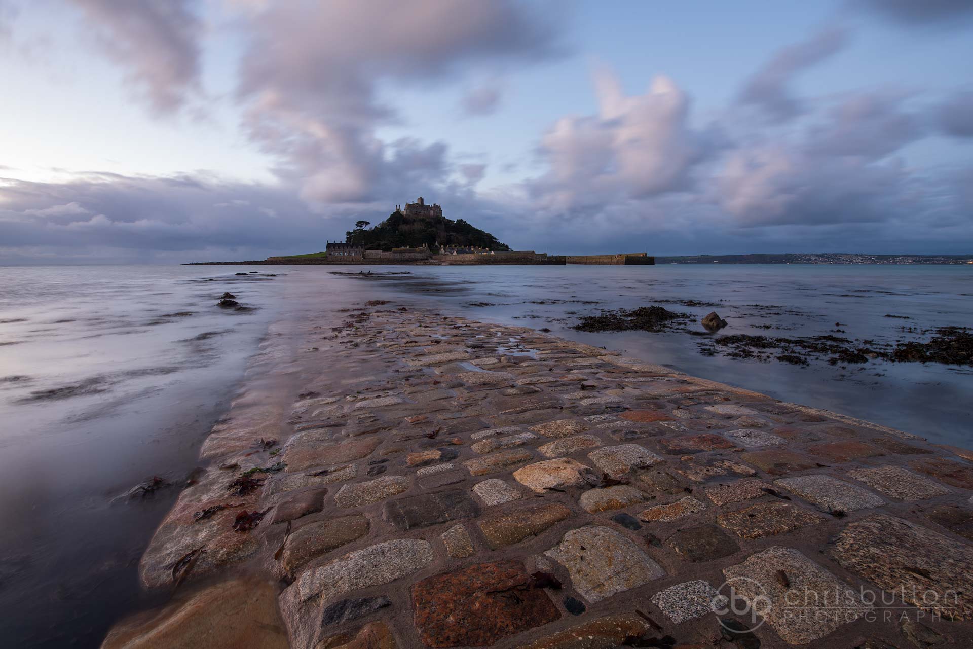 I like the cobbles at this point of the causeway and so I try and time workshop visits to co-incide with this tide height (around 2.6m Penzance Coastal Station). Adjusting white balance and tint can have a major impact on an image. I usually find that cooler tones suit the mood especially images shot before sunrise.
