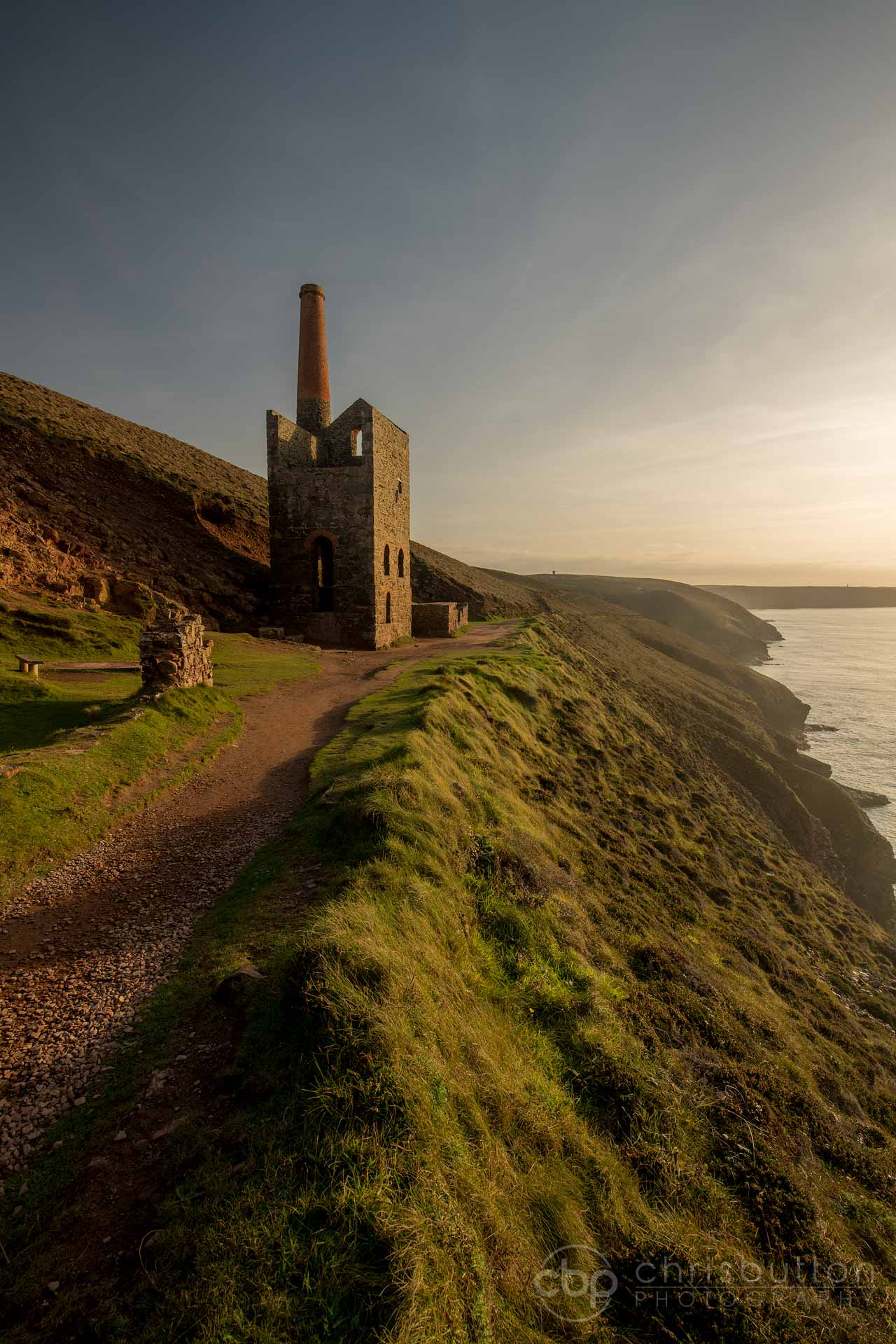 The fantastic Towanroath Engine House at Wheal Coates side lit with lovely long soft shadows.