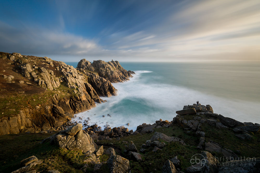 On the cliff top at Treen near Porthcurno looking along the headland at Treryn Dinas, the site of a former Iron Age Fort. Logan Rock is perched perilously at the end and although it weighs 80 tonnes it can be rocked by hand. One of the intrepid participants on the West Cornwall workshop had ventured right out to the cliff edge.