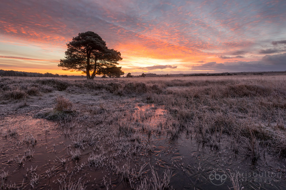 This pine tree is at Ferney Knapp on Wilverley Plain. I had scouted the location earlier in the week and with a frost forecast I decided to head back. The weather forecast was for partial cloud at dawn which was encouraging. I find it difficult to contain my excitement when I’m heading to a staked out composition and you can see that the conditions are going to be perfect.